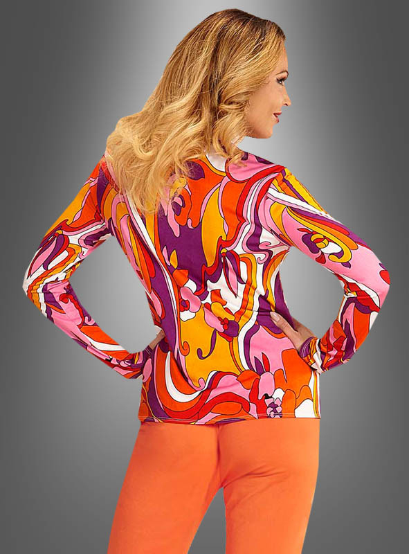 Für alle Frauen, die es bunt lieben: Die 70er Jahre Damenbluse ist genau das richtige Kleidungsstück für Sie, wenn Sie knallige Farben mögen. Blumen und Blätter ranken sich in den Farben Gelb, Orange, Lila, Rose, Rot und Weiß über die ganze Bluse. Ein wahrer Augenschmaus. Am Halsausschnitt hat die Bluse einen Kragen. Auf der Vorderseite befindet sich eine Knopfleiste, so dass Sie das schicke Oberteil auch offen tragen können.
