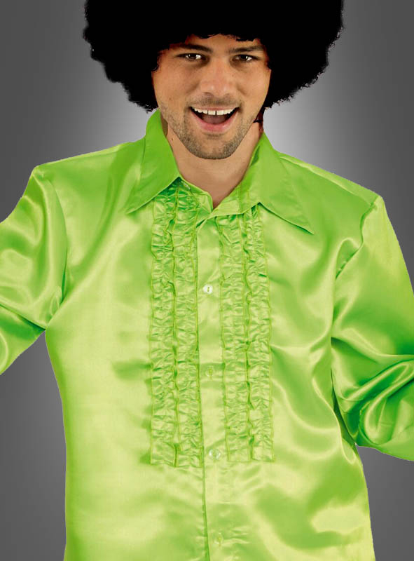 Das 70er Jahre Hemd mit Rüschen besteht aus Satinstoff, der angenehm zu tragen ist. Erhältlich ist es in den Farben grün, gelb, orange und rosa. Vom Kragen über die Brust abwärts sind zwei zweireihige Rüschenbahnen angenäht. Dieses Satinhemd in Top Qualität hat eine kräftige Farbe und schimmert toll im Licht der Discokugel. Es wird wie ein normales Hemd vorne geknöpft.