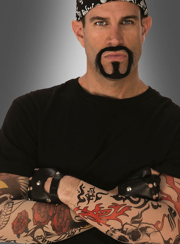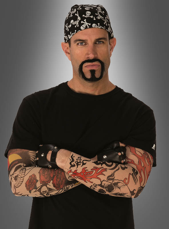 Auch als Rockstar werden Sie mit diesem Biker Zubehör Kostümset ein Held auf der Party. Im Set enthalten sind die bereits erwähnten Tattoo Armstulpen, fingerlose Nietenhandschuhe aus Kunstleder, Bart und das Bandana mit Totenköpfen und gekreuzten Knochen.