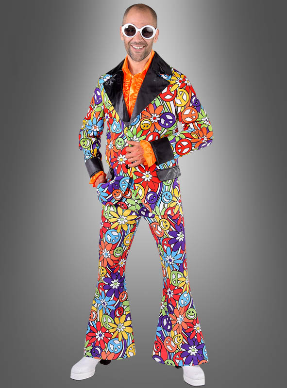 Der Herrenanzug 70er Jahre aus unserem Onlineshop ist ein verrückter Zweiteiler, mit dem Sie garantiert auffallen. Dieser Stoff ist einfach der Knaller: festes Polyester in unglaublichen Farben und wilden Mustern. Der schrille All-Over-Print überzeugt mit Blumen, Smileys und Friedenszeichen. Love. Peace. Happiness. Das Sakko ist beim Herrenanzug 70er Jahre klassisch geschnitten und wird vorne mit zwei Knöpfen geschlossen. Der üppige Kragen – ein Muss beim coolen 70er Jahre Look – ist mit schwarzem Satin besetzt. Ein toller Kontrast zu den herrlich bunten Farben. Taschenklappen und Ärmelbesatz sind ebenfalls aus Satin. Ganz stilecht werden Sie in diesem tollen Kostüm zum groovy Tänzer bei der nächsten Disco-Party.