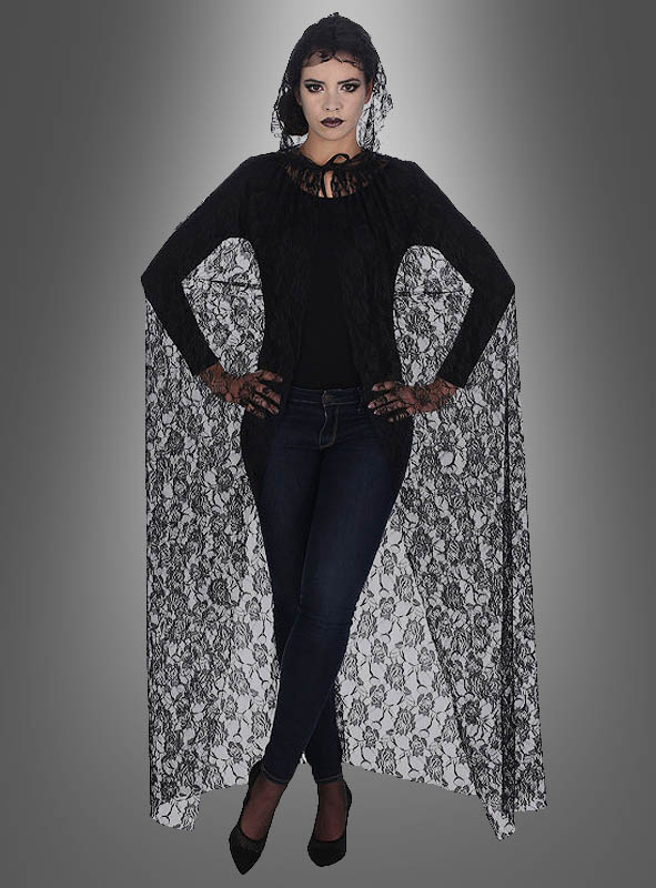 Dieser schwarze Umhang aus Spitze macht mehr aus Ihrem Gothic oder Halloween Kostüm. Elegant fällt der Spitzenstoff mit dem romantischen Blumenmuster über Ihre Schultern bis zum Boden. Die Kapuze umrahmt dabei leicht Ihr Gesicht und macht Sie zur Königin der Nacht.