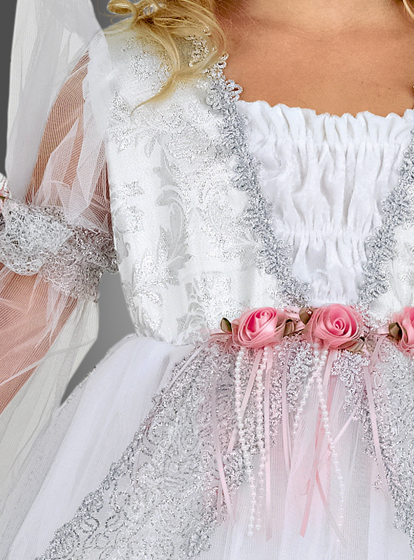 Reich verziert mit glitzerndem Tüll, silberner Paillettenborte und Perlen verziert. Außerdem schmücken schöne Stoffrosen die Ärmel und die Taille. Die Krone besteht aus einem Haarreif mit einer Krone aus funkelnden, silbernen Pailletten. Das Kleid hat einen Reißverschluss am Rücken. Rockreif nicht enthalten.