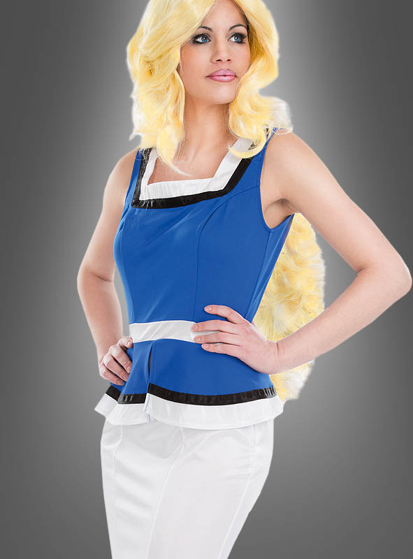 Der enge weiße Rock ist im unteren Bereich glockenförmig weit geschnitten. Das gibt dem Falbala Kostüm das Aussehen einer Diva. Der lange Rock kann bis Unterbrust hochgezogen werden und wird so perfekt je nach Körpergröße bodenlang angepasst. Die geniale Methode verhindert, dass durch das kurze Oberteil der Bauch rausblitzt. Knapp über dem Saum ist er mit einem hellblauen Streifen verziert. Die Qualität des Kostüms ist außerordentlich gut.