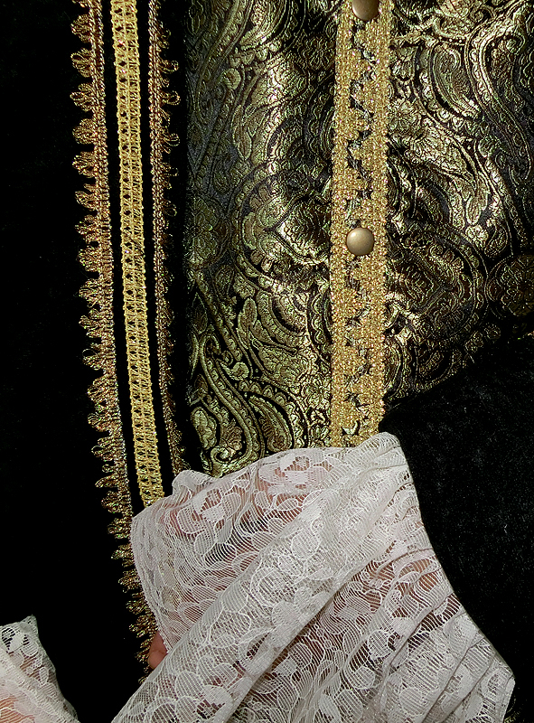 Die Jacke hat vorne eine einnähte West aus edlem gold-schwarzem Brokat. Goldene Borte vorne und Druckknöpfe. So lässt sich die Jacke bequem öffnen und schließen.