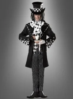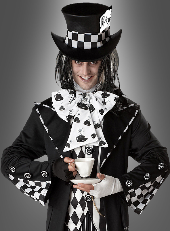 Der verrückte Hutmacher Kostüm für Herren in coolem Schwarz und Weiß. Das Kostüm besteht aus einem langen schwarzen Jackett mit tollen Knöpfen und breitem Kragen. Die Ärmel sind unten weit geschnitten mit einem Keileinsatz aus schwarz-weiß kariertem Stoff. Die Weste hat ebenfalls die schönen Spiral-Zierknöpfe und ist mit zwei verschiedenen Mustern gestaltet. Die eine Seite ist mit Rauten versehen, die andere mit breiten Streifen. Die Hose hat einen bequemen Gummizug im Bund und feine weiße Streifen. Der große Zylinder ist aus Stoff und mit einem breiten Hutband versehen. (Spielkarte nicht enthalten) Um den Hals trägt er eine breite Schleife mit Kaffeetassen-Motiven. Fingerlose Handschuhe und Gamaschen mit schwarzen Knöpfen vervollständigen dieses famose Kostüm aus dem Wunderland.