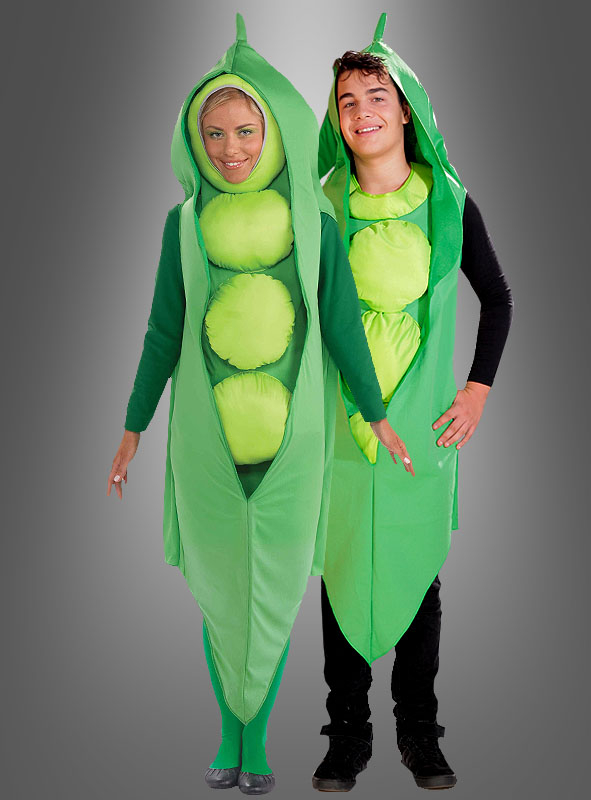 Das Erbsenkostüm wird über den Kopf angezogen wie ein Pullover und ist ideal für den Straßenkarneval geeignet. Die wattierten Erbsen mit einer Kapuze werden vorne wie ein Hemdeinsatz einfach unter das Kostüm geschoben.