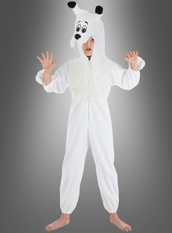 Das Idefix Kostüm für Kinder besteht aus einem weißen, kuschelig weichem Plüsch Overall mit einem langen Reißverschluss vorne. Die angenähte Kapuze ist zugleich das Kopfteil mit gestickten Augen, der großen schwarzen Nase aus Samt und den Hundeohren. Die Ohren können durch einen eingebauten Draht in verschiedene Richtungen fixiert werden. Links und rechts von der Nase und oben am Kopf ist Langhaarplüsch eingenäht. Auch vorne im Brustbereich ist das zottelige Plüsch eingearbeitet. Und natürlich fehlt auch der Schwanz hinten am Kostüm nicht. Das niedliche originalgetreue Gesicht von Idefix wird Sie überzeugen.