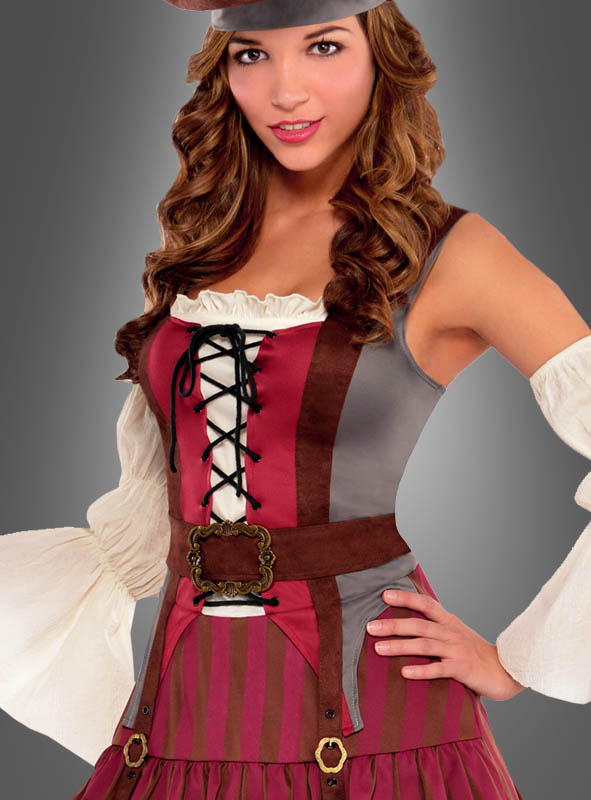 Das Piratinnen Kostüm besteht aus einem Minikleid in erdigen Tönen mit sexy Miederschnürung und tiefem Dekolleté. Die opulente Gürtelschnalle stammt vielleicht aus dem letzten Beutezug? Seeräuberinnen tragen sie mit Stolz, denn diese besonderen Details wie angenähter Gürtel und dekorative Strumpfhalter mit Schnalle machen aus dem Piratinnen Kostüm eine ganz besondere Verkleidung. Da würde auch Captain Jack Sparrow mehr als ein Auge riskieren.