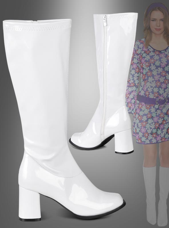 Für viele Retro Kostüme sind Lackstiefel in weiß die ideale Ergänzung und ein richtiger Blickfang Dank des hohen Absatzes. Perfekt für alle kurzen Röcke und Kleider zum Thema 60er und 70er Jahre.