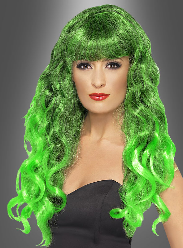 Die Langhaarperücke mit Pony ist leicht und sehr angenehm zu tragen. Die grüne Perücke leuchtet in schönem Neongrün und ist von dünnen schwarzen Strähnchen durchzogen. Auch die blaue, einfarbige Perücke hat einen intensiven Farbton. Beide Damenperücken haben einen wundervollen Glanz.