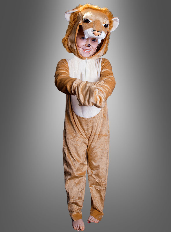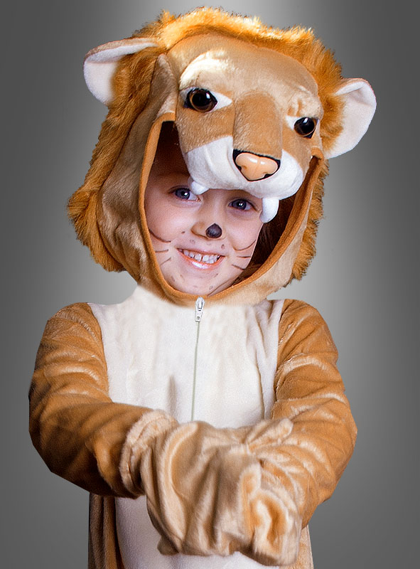 Das Tierkostüm besteht aus einem weichen Overall aus samtigem Velours Plüsch und versteckt eingenähtem Reißverschluss vorne. Hinten ist ein Schwänzchen befestigt. Das Deluxe Kopfteil mit Löwenmähne aus Plüsch und wunderschön gestaltetem Löwengesicht ist am Overall angenäht.