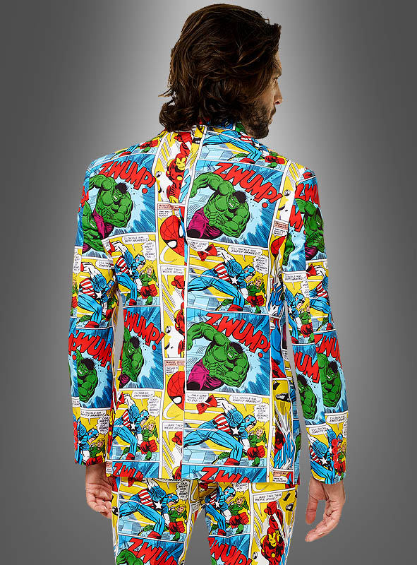 Der Anzug in Deluxe Qualität ist mit dem Muster sich wiederholender Comic-Panels bedruckt. Abgebildet sind Szenen mit den Marvel Helden Captain America, Spider-Man, Hulk und Iron Man. Dazu gibt es natürlich jede Menge Sprechblasen.