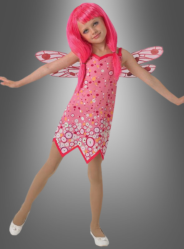 Das Kostüm besteht aus einem pinkfarbenen Kleidchen mit Kreismuster. Die Flügel können mit Klettverschluss am Kleid befestigt werden und sind ebenfalls im Lieferumfang enthalten.
