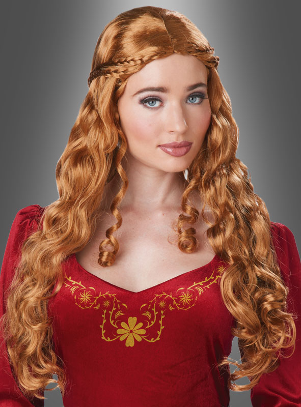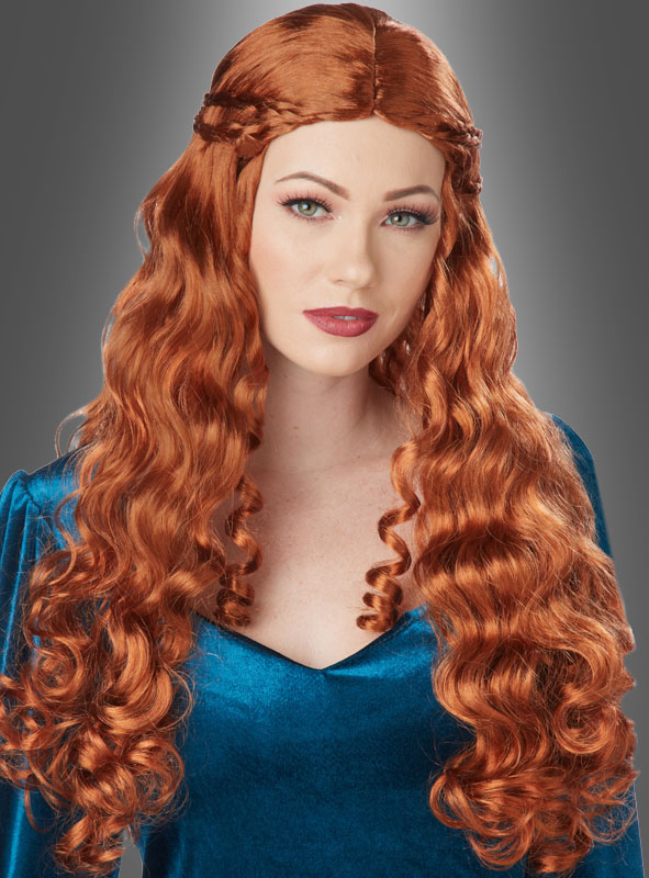 Die lange Lockenperücke hat vorne zwei kürzere Strähnen mit Korkenzieherlocken. An der Stirn sind je zwei dünnere Zöpfe geflochten, die am Hinterkopf mit einem kleinen Gummiband gebunden sind. Eine verspielte, romantische Frisur für Jungfrauen aus lang vergangenen Tagen. Erhältlich ist die Mittelalter Perücke in dunklem rotblond, kastanienbraun und dunkelbraun. Für jede Prinzessin ist etwas dabei.
