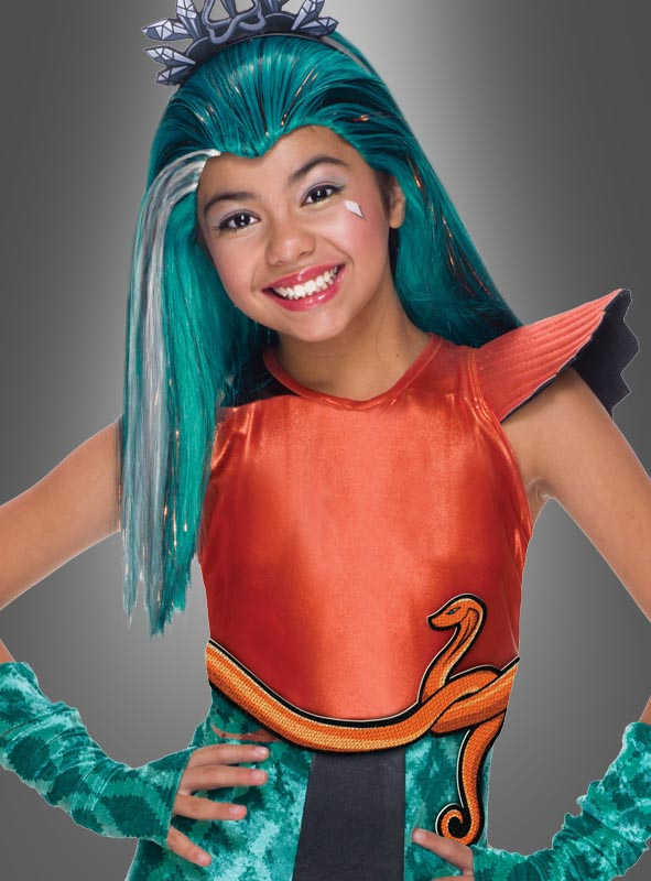 Das Nefera Monster High Kostüm beinhaltet ein zweifarbiges Kleid in orange und türkisgrün. Das Oberteil des Kleides ist in glänzendem und schimmerndem Orange gehalten. Auf der linken Schulter ist ein schöner Schulterflügel angenäht, welcher mit Schaumstoff unterfüttert ist. Die rechte Seite ist mit einem schwarzen Träger ausgestattet. Oberteil und Rockteil werden durch einen angenähten Gürtel getrennt, der die Form einer Schlange hat. Der Gürtel verziert nur die Vorderseite. Vorne am Kleid befindet sich eine schmale, schwarze Schürze als Zierelement. Der Stoff im schräg geschnittenen Rockteil ist aus Samt mit glänzendem Muster genäht. Ebenfalls im Lieferumfang enthalten sind die passenden Armstulpen sowie ein Haarreif mit Schlangenkrone.