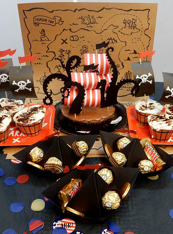 Pappbecher, Pappteller, Strohhalme und Piraten Servietten mit Anker sorgen für Spaß beim Geburtstagstisch. Die Cupcakes oder Muffins werden mit den Piratensegel Sticks verschönert. Ein weiteres Highlight ist die Kuchendekoration. Rot-weiß gestreifte Segel und schwarze, fürchterliche Kraken Tentakel aus Karton werden mit Holzspießen in den Geburtstagskuchen gesteckt. So sieht es aus, als ob das Schiff von dem Kraken in die Tiefe des Kuchens gezogen wird. Beeindruckend!