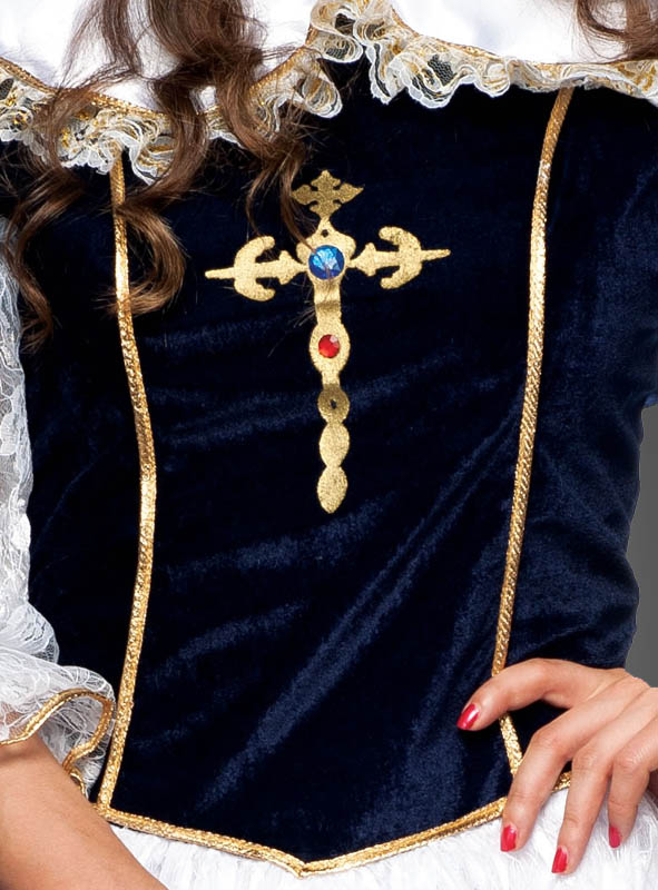 Das königsblaue Musketier Kostüm aus feinem Samtstoff ist ein Kleid mit goldenen Borten verziert und gesäumt. Der Kragen ist aus weißem Satin, der ebenfalls mit Goldborte gesäumt und zusätzlich mit weiß-goldener Spitze verziert ist. Der mehrlagige Rockbereich des Kleids ist aus weißem Satin mit angenähter weicher Spitze. Auch die Ärmel des Musketier Kostüms für Damen sind aus dem gleichen Spitzenstoff gefertigt. Am Armauschnitt oben ist blauer Samtstoff eingenäht, der wie ein kleiner Umhang über die Spitzenärmel fällt.