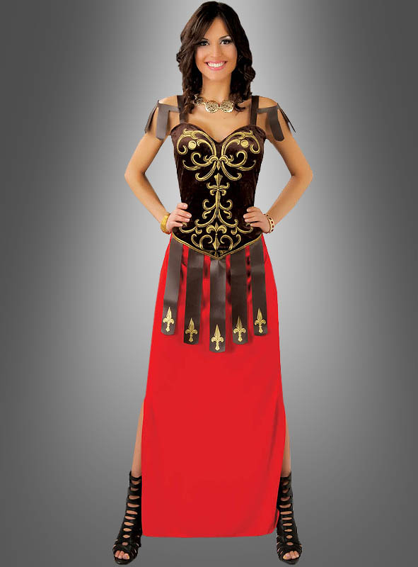 Das beeindruckende Kriegerin Kostüm besteht aus einem knöchellangen Trägerkleid. Die braunem Leder nachempfundenen Riemen schmücken die Schultern durch aufgesetzte Lederfransen. Das wunderschöne Korsett aus braunem Samt ist mit goldfarbenen Ornamenten versehen, die sich farblich sehr schön vom Untergrund abheben. Der Samt ist leicht dehnbar und kann durch zwei Bindebänder im Rücken noch mehr auf Taille gebracht werden.