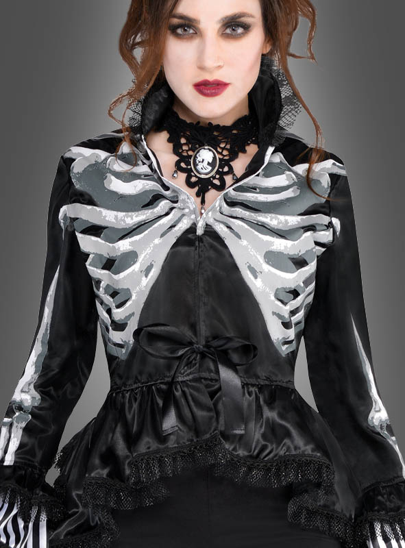 Die Jacke im viktorianischen Stil hat einen tollen Schnitt und ist hinten länger wie bei einem Gehrock. Daher wirkt sie sehr elegant. Im Brustbereich und an den Ärmeln ist die Jacke mit Knochen bedruckt. Den Saum ziert schwarze Spitze, die Jacke selbst ist aus leicht glänzendem Satinstoff gefertigt. Am Saum der Ärmel sind zweilagige weite Ärmelabschlüsse angenäht. Diese sind aus schwarz-weiß gestreiftem Stoff und einer Schicht schwarzem Satin mit Netzstoff-Einlagen genäht. Auch die längere Schleppe hinten hat am Saum hat diesen tollen Abschluss. Weiche Schulterpolster geben der Jacke eine tolle Form. Vorne wird sie mit einem Haken und einer Satinschleife geschlossen. An den Handgelenken verzieren kleine schwarze Schleifen die Ärmel noch zusätzlich.