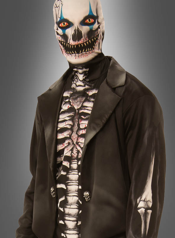 Beim ärmellosen Shirt sind vorne Rippen und Knochen aufgedruckt. Der Skelettdruck ist sehr realistisch mit vielen Schattierungen und Blutspritzern versehen. Die Totenkopf Strumpfmaske ist wie eine Kapuze befestigt, nur dass sie vorne angenäht ist und sehr einfach über das Gesicht gezogen werden kann. Man kann durch den Stoff mit dem schaurigen Totenkopfdesign schemenhaft hindurchsehen. Für bessere Sicht ist die Maske schnell vom Gesicht gezogen und hängt dann vorne am Ausschnitt herab. So kann nichts verloren gehen. Im hinteren Bereich sind am Shirt ein Schlitz und Klettverschluss angebracht.