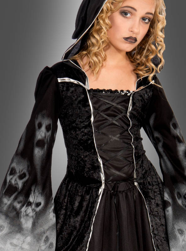 Langes Kleid aus schwarzem Pannesamt mit silberner Borte eingefasst. Vorne eingesetzter Stoff mit Schnürung im Brustbereich. Auf den schönen weiten Trompetenärmeln und im vorderen Rockbereich sind die Seelen der gequälten Geister aufgedruckt. Geisterhafte Gesichter aus der Unterwelt. Am Kleid ist eine schöne weite Kapuze angenäht.
