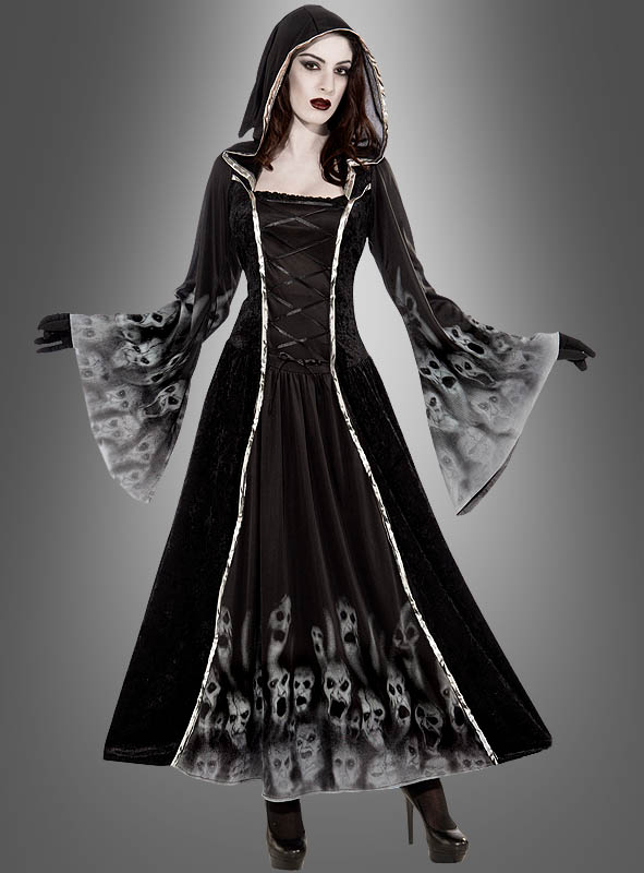 Das lange schwarze Kleid aus Pannesamt ist mit silberner Borte verziert. Im Brustbereich kann es geschnürt werden. Auf dem unteren Bereich sowie an den Trompetenärmeln sind die verlorenen Seelen aufgedruckt, die als geisterhafte Köpfe aus dem Nichts zu kommen scheinen. Seitlich angenähte breite Stoffbänder, mit denen man das Kleid im Rücken binden kann. Ideal, um die Passform in der Taille anzugleichen. Die Kapuze ist am Kleid angenäht, so dass sie bei Bedarf leicht auf- und abgezogen werden kann.