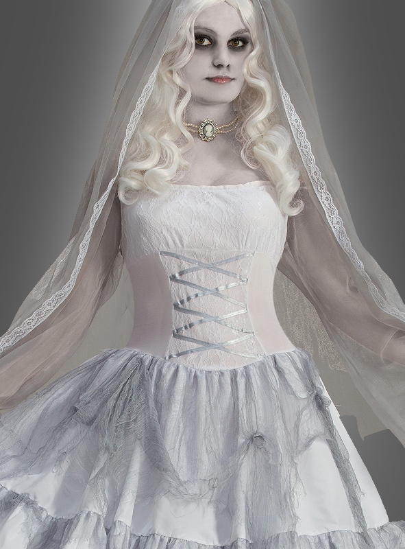 Damit die Geisterbraut noch authentischer aussieht, wird verschiedenes Zubehör empfohlen, welches hier im Online-Shop ebenfalls erhältlich ist. Neben der passenden Schminke empfehlen sich farbige Kontaktlinsen, lange Handschuhe und natürlich ein Blumenbouquet.