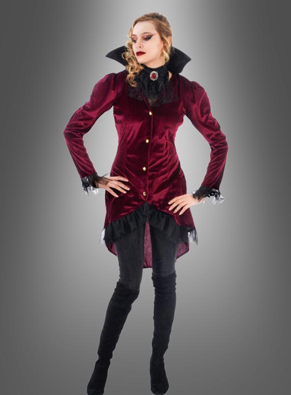 Die samtige, dunkelrote Kostümjacke ist sehr wandelbar. Der hochgestellte Kragen macht Sie zu einer Vampirin, die unbedingt Blut trinken möchte. Wenn Sie den Kragen aber nach unten klappen, können Sie diese Longjacke in Gehrock Art auch als Piratin oder zu einem retrofuturistischen Steampunk Outfit tragen. Mit dem passenden Zubehör können Sie auch eine geheimnisvolle Zauberin sein. Denn die wandelbare Kostümjacke ist inspiriert von den Gehröcken der Jahrhundertwende und passt zu vielen Verkleidungen.
