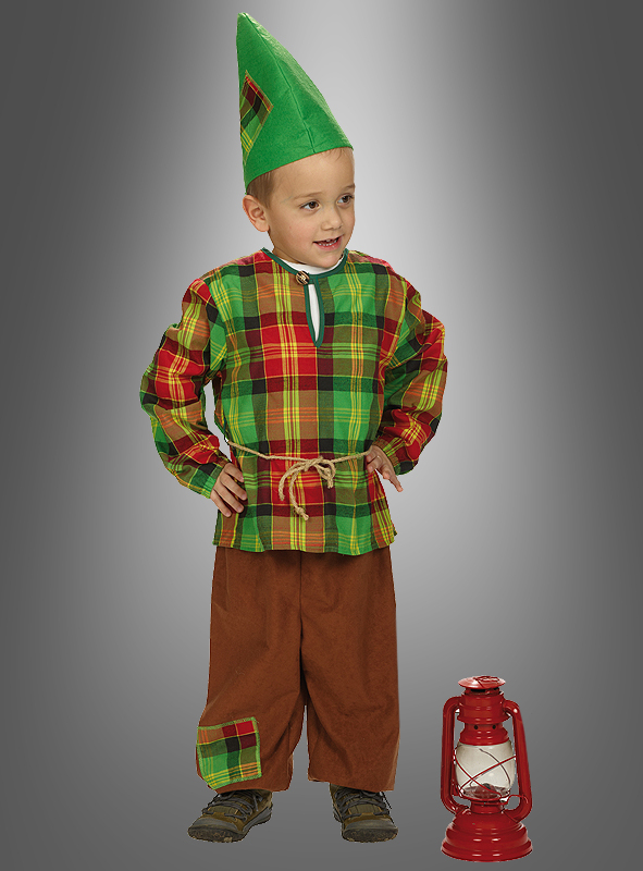 Kariertes Hemd mit schönem Zierknopf am Ausschnitt und einem Juteband als Gürtel. Die Hose ist (anders als abgebildet) eine 3/4 Hose aus braunem Velourstoff mit kariertem Flicken auf dem Knie. Die passende grüne Zwergenmütze ist natürlich auch mit dabei. Sie hat ebenfalls einen Flicken aus dem karierten Hemdstoff.