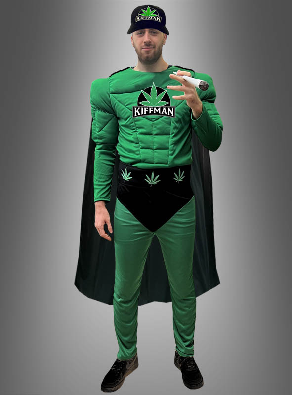 Unser witziges Kiffman Kostüm ist ein praktischer 2-Teiler und der Renner auf jedem Junggesellenabschied oder bei Festivals und im Karneval. Der Superheld Kiffman ist der beste Freund von Suffman. Ein tolles Partnerkostüm für lustige Abende.