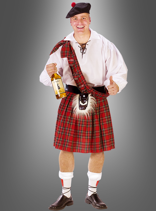 Lieferumfang: Schottenrock, Hemd (Umfang 150 cm), Mütze, Gürtel mit Fellbeutel, Schärpe mit 4 Kunststoff-Schnaps-Gläsern.